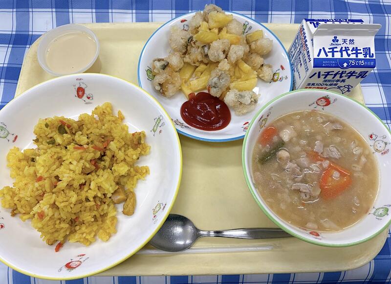 チキンライス、セルフオムライス、生揚げのスープ、キャラメルポテト、牛乳