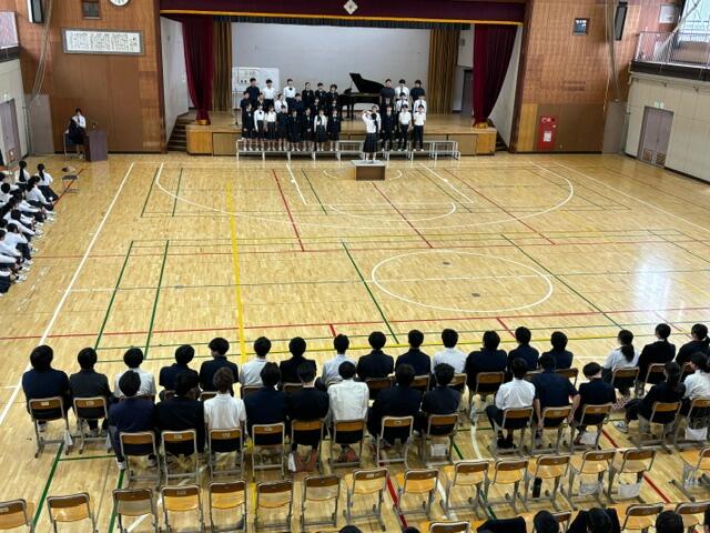 今日は、3校時に2年生、4校時に1年生の合唱リハーサルを行いました。写真は、2年生です。これまで各クラスで練習してきましたが、今日はお互いに聞きあうことができました。それぞれの発表を聴き、それぞれのいいところを取り入れて、クラスの力にしていけるといいですね。