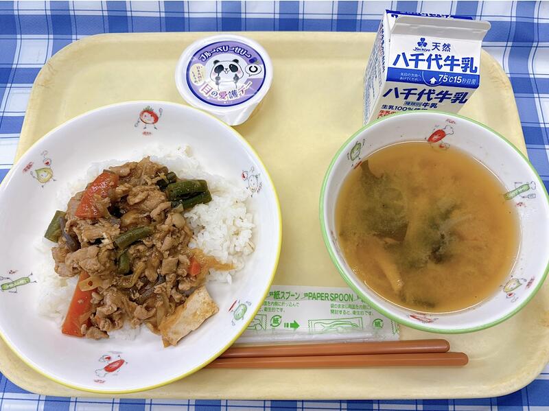 麦ごはん、豚肉丼(具)、さつまいもの味噌汁、目の愛護デーゼリー、牛乳