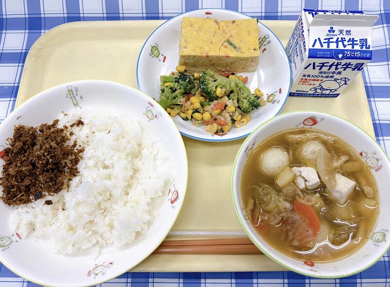 ごはん(強化米入り)、エコふりかけ、ぎせい豆腐、ブロッコリーのおかかツナマヨ、だまこ汁、牛乳