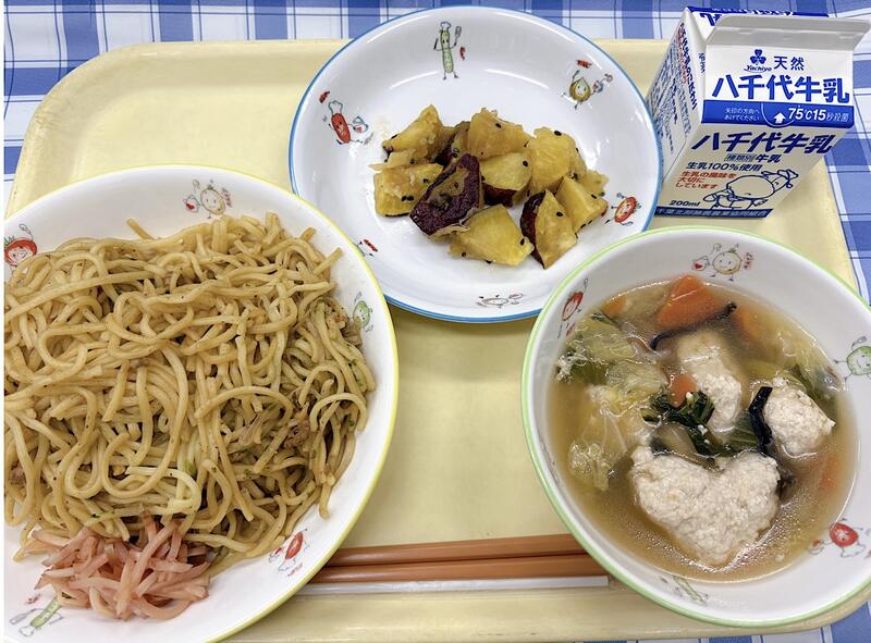 ソース焼きそば、鶏だんごスープ、大学芋、牛乳