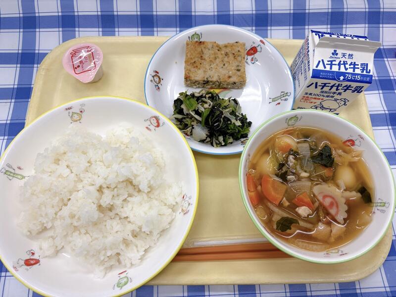 11月25日(火)の給食です 投稿日時 : 11/25 編集長 ごはん、このしろのさんが焼き、磯香和え、白玉スープ、一口いちご牛乳プリン、牛乳 昨日、11月24日は「いい日本食」の語呂合わせで「和食の日」でした。 「和食」は、日本の伝統的な食文化で素材の味や季節感を大切にしているのが特徴です! 2013年には「ユネスコ無形文化遺産」にも登録されました 今日は下貝塚中ブロック(大野小、宮久保小、北方小)合同の「和食統一献立」になっています