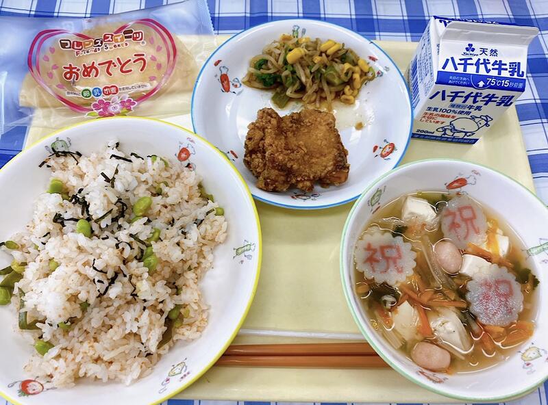 花寿司、鶏肉の唐揚げ、菜の花和え、お祝い汁、お祝いクレープ(いちご)、牛乳