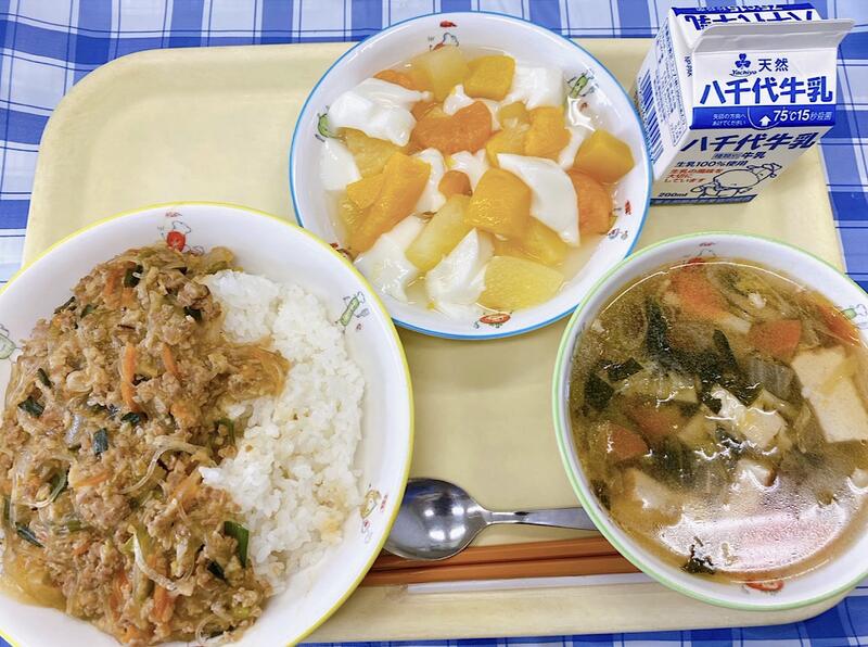 ごはん、マーボー春雨丼(具)、生揚げの中華スープ、フルーツ杏仁豆腐、牛乳