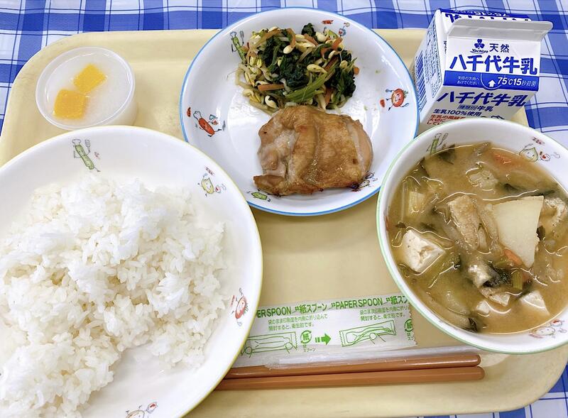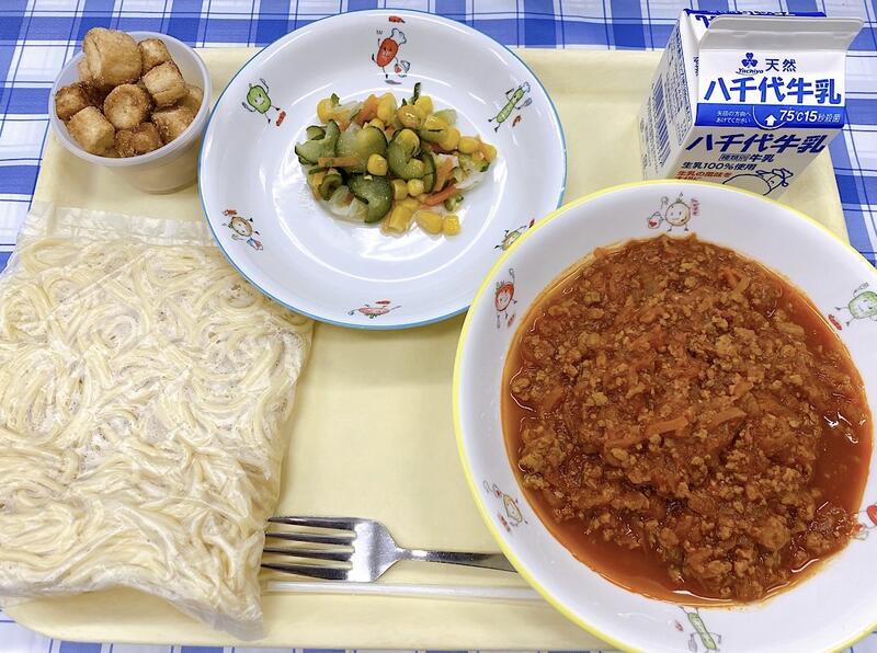 ※給食室の食器乾燥機が故障したため、紙皿の食器になっています。