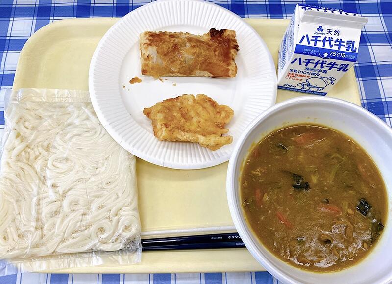 うどん、カレーうどん(具)、かしわ天、アップルパイ、牛乳