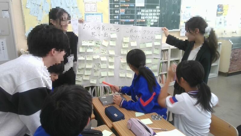 今日は、学生さんが69名来てくださり、1年生と様々な活動を行いました。各クラスのテーマは、「今日、あなたのことを知りました。」「みんな違ってめっちゃいい!!」「自分を知ろう、クラスを知ろう」「未来への羅針盤」「私の未来のシナリオ」です。最初は緊張気味の1年生でしたが、学生の皆さんの働きかけのおかげでどんどん打ち解け、元気に活動することができました。
