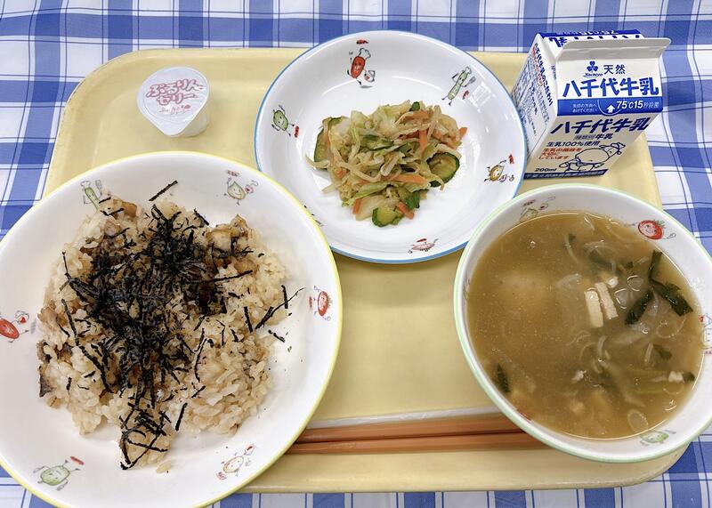 このしろひつまぶし、もやしとキャベツの和え物、すいとん、ひとくちピーチゼリー、牛乳