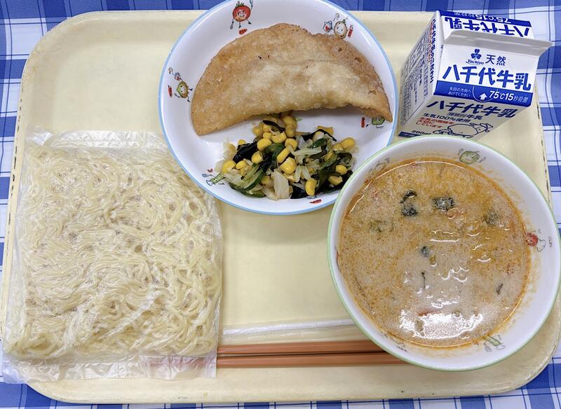 中華麺、豆乳坦々麺(具)、揚げぎょうざ、わかめサラダ、牛乳