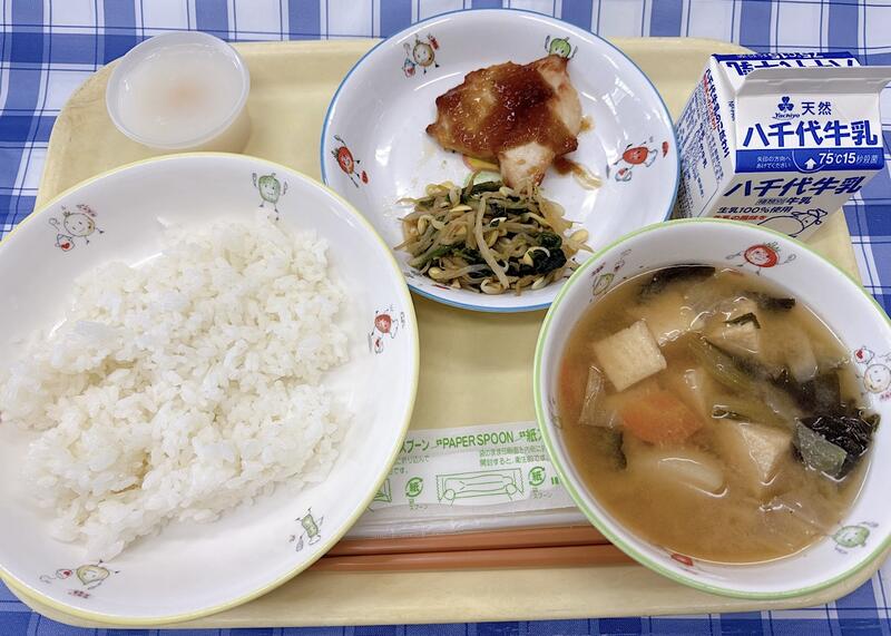 ごはん、鶏肉の梨ジンジャーソース、大豆もやしのナムル、八宝みそ汁、カルピスゼリー、牛乳