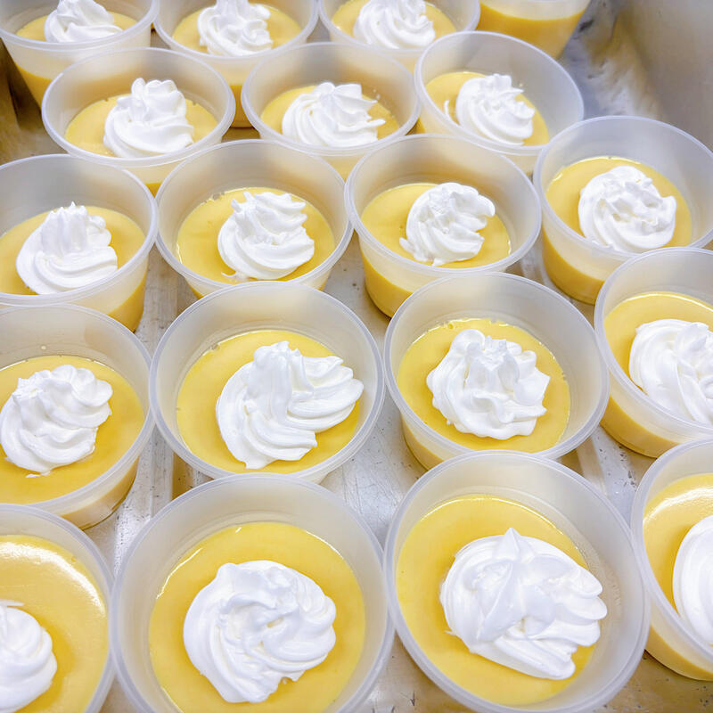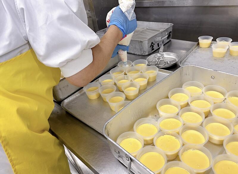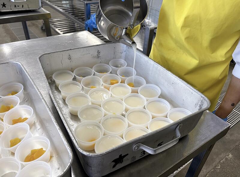 黄桃を入れたゼリーカップに、やかんを使ってゼリー液を注いでいます