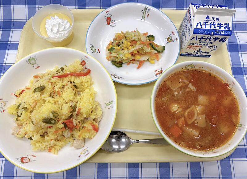 パエリア風ピラフ、コーンサラダ、ミネストローネ、かぼちゃプリン、牛乳