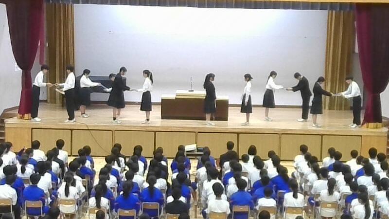 本日より、令和7年度の後期が始まりました。今日は、そのけじめの全校集会を行いました。英語スピーチコンテストや平和学習の発表の後、新生徒会本部の認証式、引継ぎ式、そして中央専門委員長の任命などが行われました。