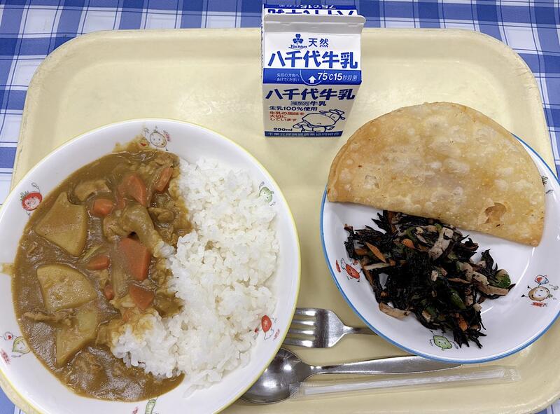 ごはん、ポークカレー、ひじきのマリネ、かぼちゃの包み揚げ、牛乳