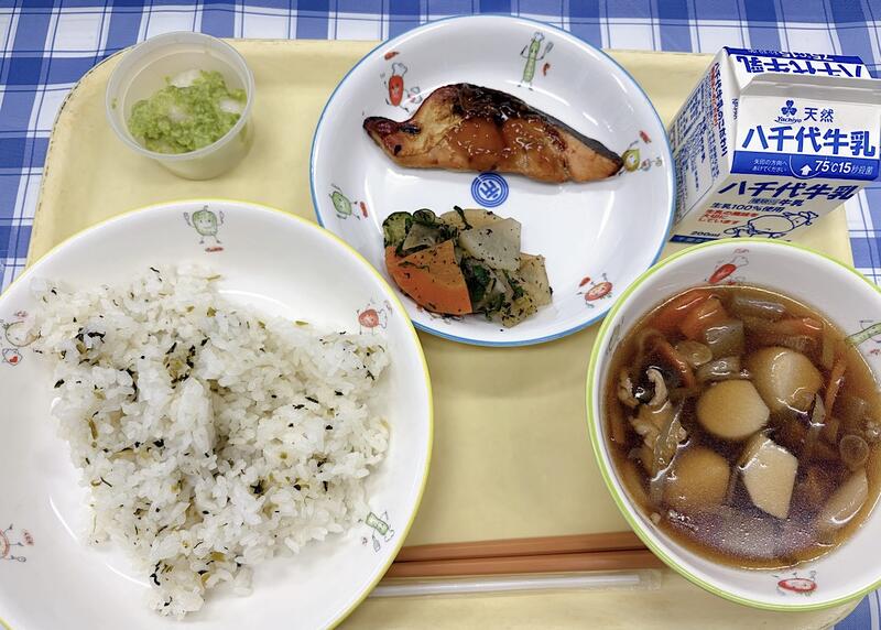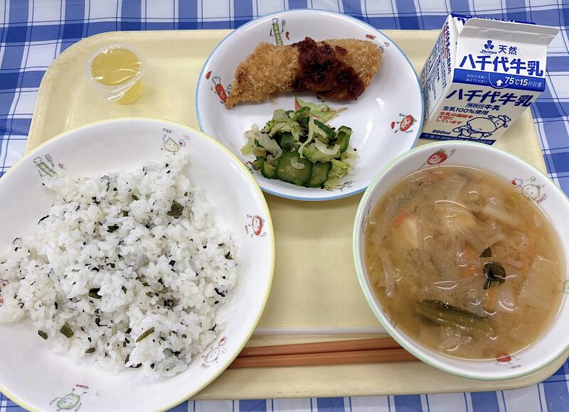 カミカミわかめごはん、ささみチーズフライ、キャベツの昆布和え、生揚げのみそ汁、ひとくちはちみつレモンゼリー、牛乳