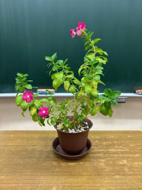 1年生のあるクラスで咲いているお花です。5月の初めころに教室に置いた鉢を、みんなで協力して育ててきました。半年近くたった今でも、元気に咲いています。このお花「日日草」の花言葉は、「友情、楽しい思い出」だそうです。これからも、みんなの友情を大事にして、充実した学校生活を送れるといいですね。