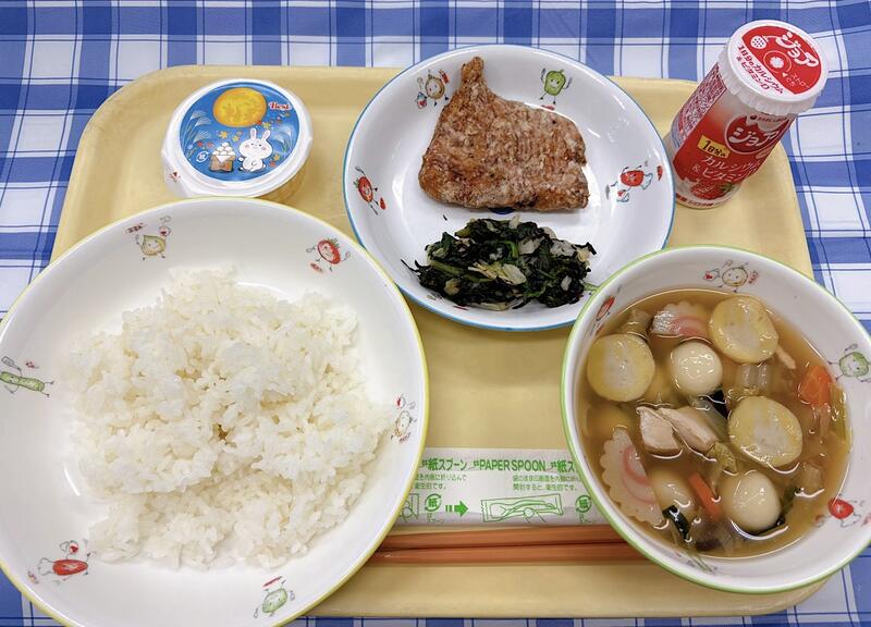 ごはん、鶏肉のから揚げ、磯香和え、お月見汁、十五夜デザート、ジョア(ストロベリー)