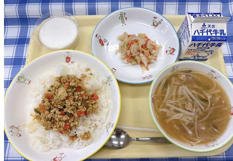 ごはん、ガパオライス(具)、ソムタム風サラダ、フォースープ、タピオカミルク、牛乳