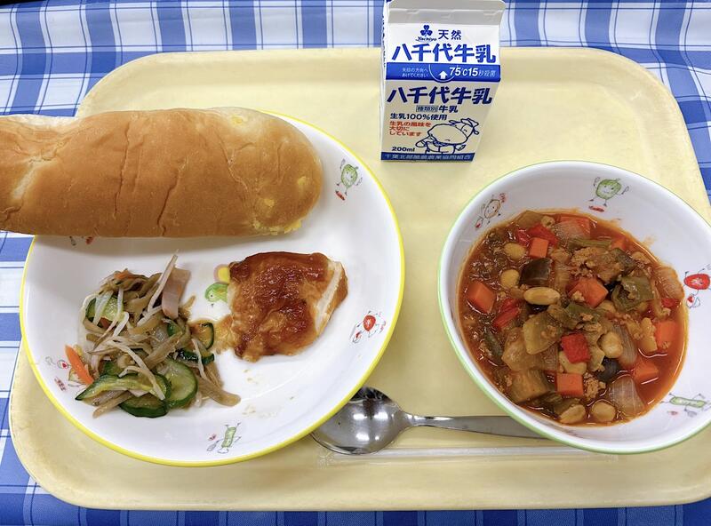 さつまいもパン、鶏肉のアップルソース、フレンチごぼうサラダ、ラタトゥイユ、牛乳