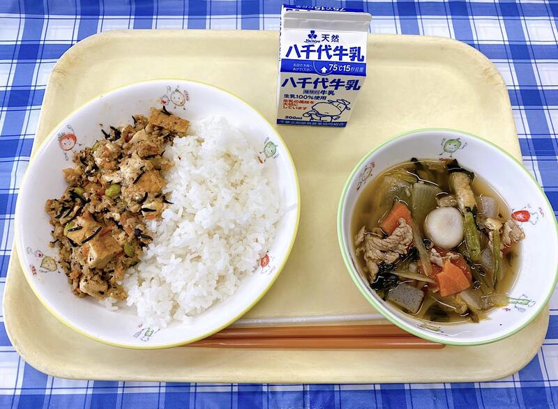 ごはん、生揚げの肉味噌煮(具)、けんちん汁、牛乳