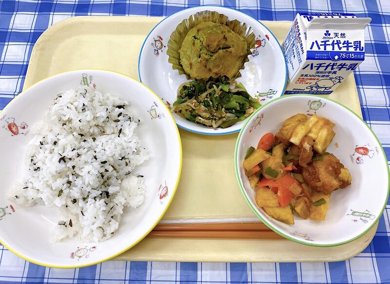 わかめごはん、鶏肉とじゃがいもの揚げ煮、ごま酢和え、抹茶ケーキ、牛乳