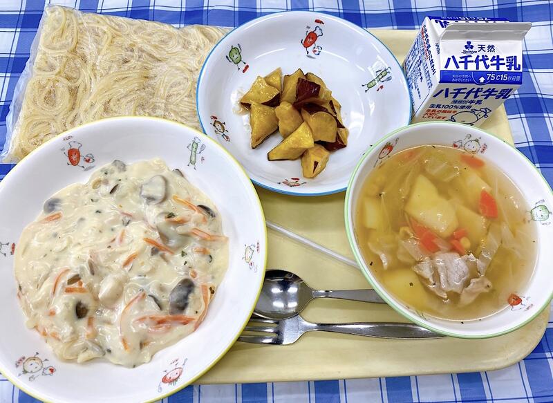 スパゲティ、クリームスパゲティ(具)、コンソメスープ、キャラメルポテト、牛乳