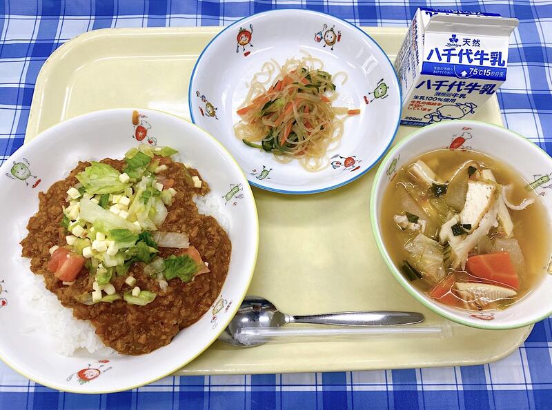 ごはん、タコライス(具)、バンサンスー、冬瓜の中華スープ、牛乳