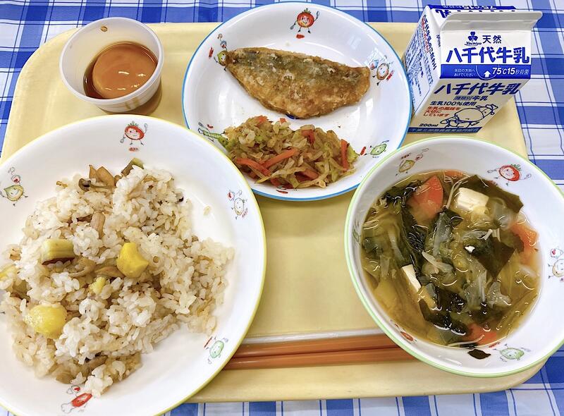 秋の香りごはん、あじのから揚げ、キャベツともやしの和え物、具だくさん味噌汁、かぼちゃみたらし団子、牛乳