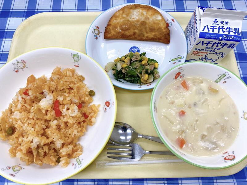 ケチャップライス、ツナサラダ、秋野菜のクリーム煮、かぼちゃの包み揚げ、牛乳