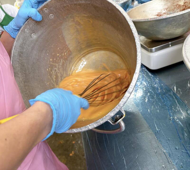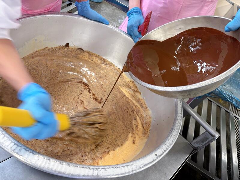 卵、生クリームを合わせ混ぜ、溶かしたチョコレートを加えていきます
