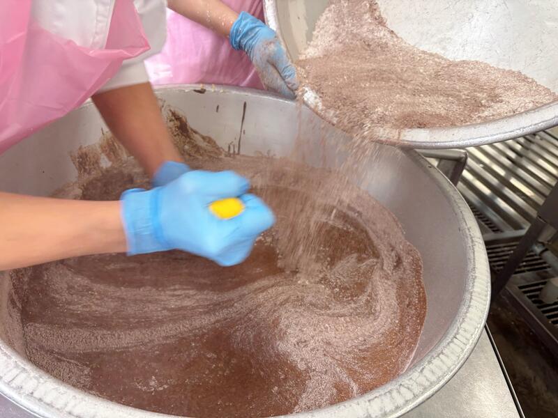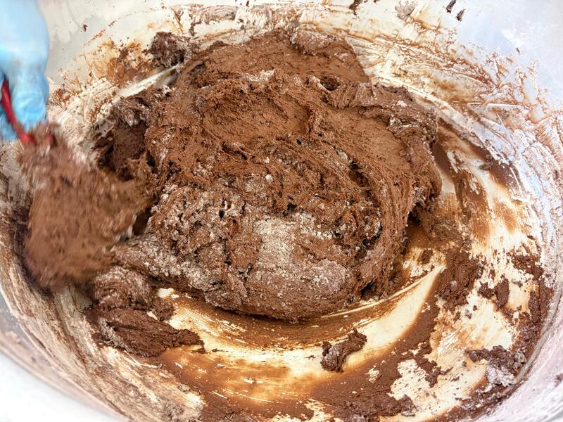 砂糖、ココア・小麦粉・バーキングパウダーを合わせてふるった粉を加えさらに混ぜます