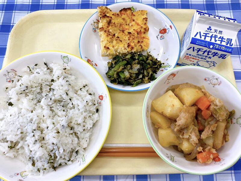 わかめごはん、ぎせい豆腐、のり和え、塩肉じゃが、牛乳