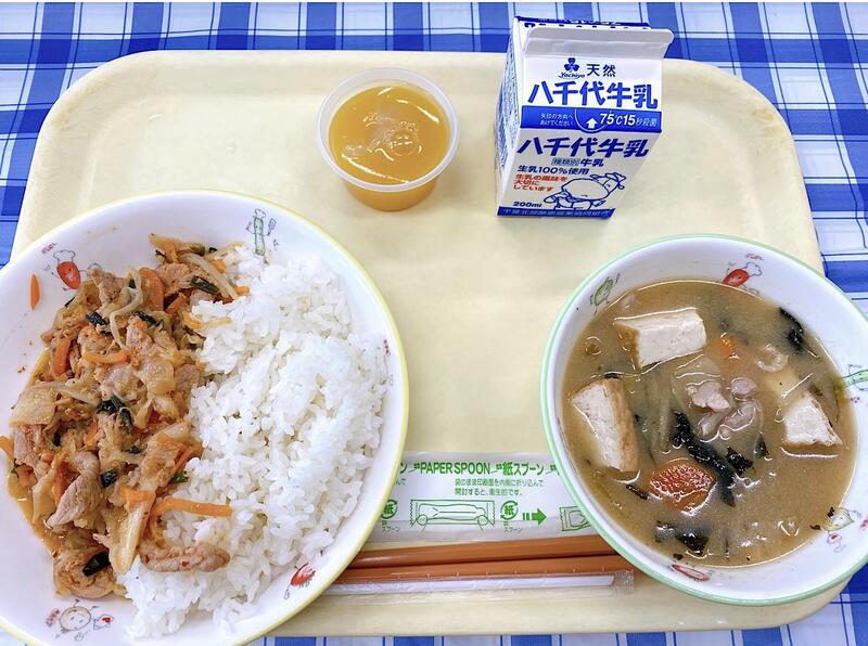ごはん、豚キムチ丼、生揚げの味噌汁、オレンジゼリー、牛乳