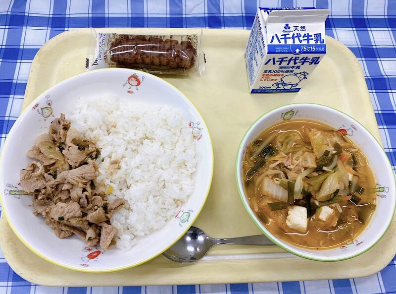 ごはん、市川の梨入り焼肉丼(具)、豆腐チゲ、原宿ドック(ココアバナナ)、牛乳