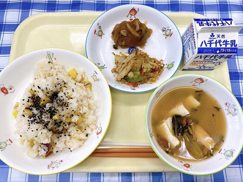 さつまいもごはん、ごま塩、いわしつくねのみぞれあん、おかか和え、なめこの味噌汁、牛乳