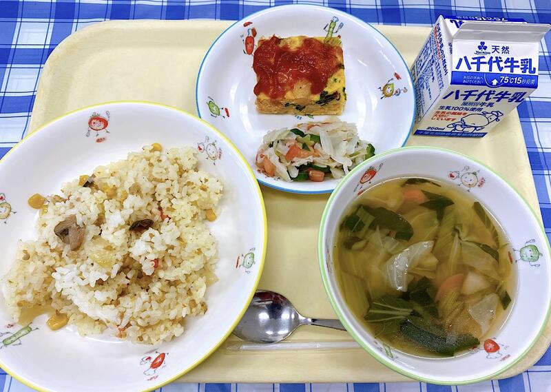 メキシカンライス、ポテトオムレツ、フレンチサラダ、野菜スープ、牛乳