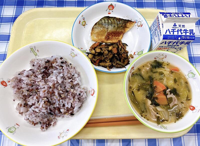 五穀米、さばの塩こうじ焼き、ひじきと大豆の煮物、味噌つみっこ、牛乳