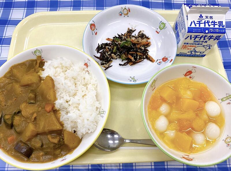 ごはん、夏野菜カレー、ひじきのマリネ、フルーツ白玉、牛乳