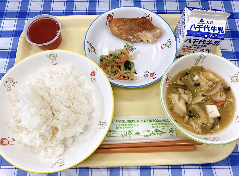 ごはん、赤魚の西京焼き、じゃこと水菜のサラダ、せんべい汁、こんにゃくゼリー(ぶどう)、牛乳