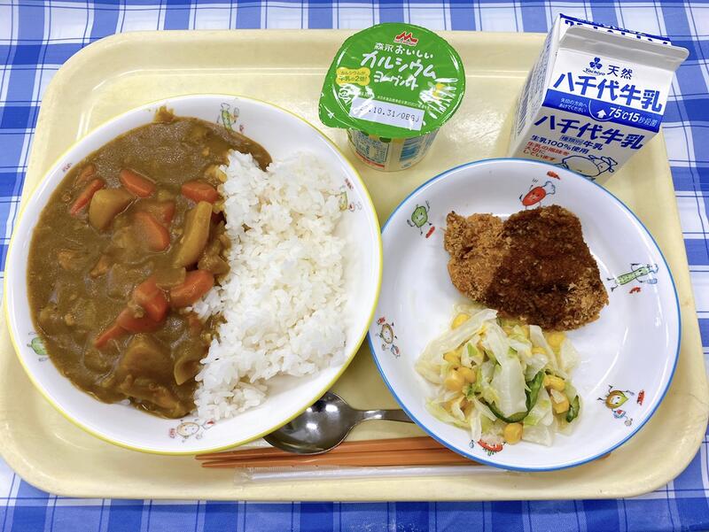 ごはん、チキンカレー、とんかつ、キャベツコーンサラダ、ヨーグルト、牛乳
