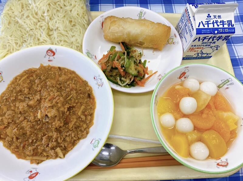 冷やし中華麺、ジャージャー麺(具)、ポテト春巻き、くらげ和え、フルーツ白玉ら、牛乳