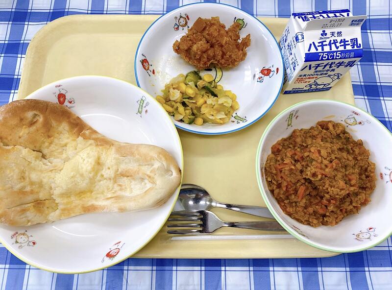 チーズナン、ドライカレー、クリスピーチキン、インド風ドレッシングサラダ、牛乳
