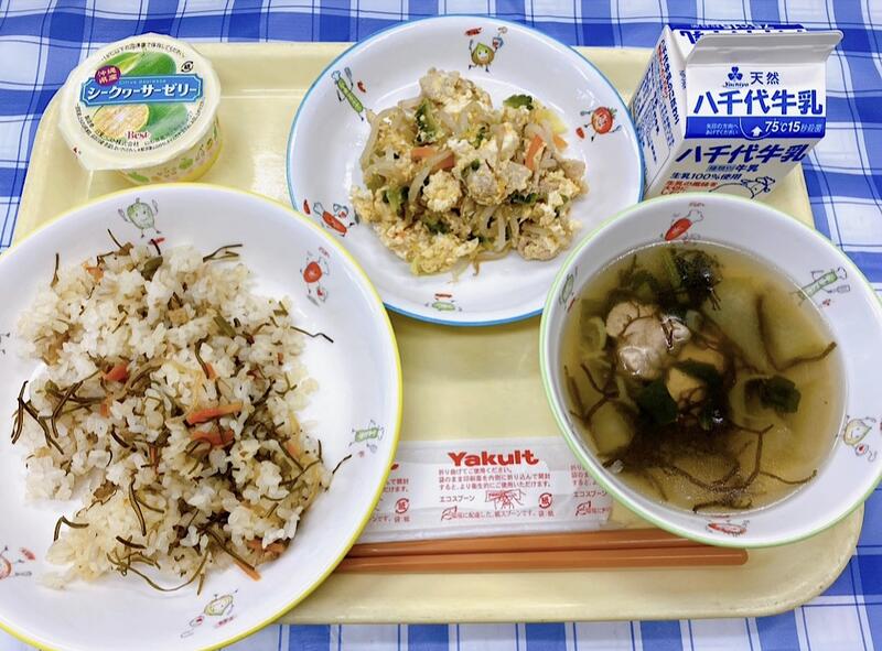 クファジューシー、ゴーヤチャンプルー、ソーキ汁、シークヮーサーゼリー、牛乳