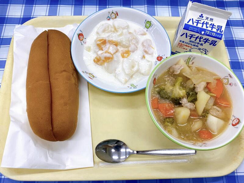 カレーミートサンドパン、ポトフ、ヨーグルト和え、牛乳