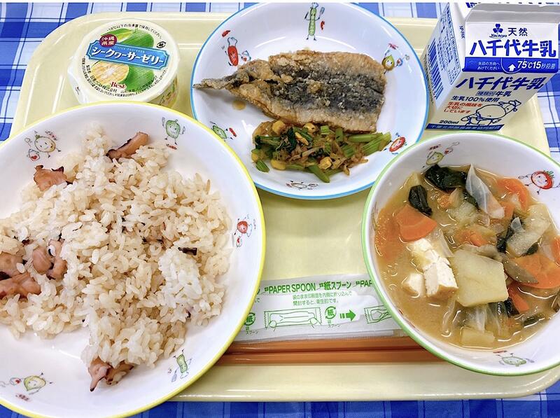 たこめし、いわしのガーリックフライ、もやしとコーンのおかかあえ、生揚げの味噌汁、シークーワーサーゼリー、牛乳