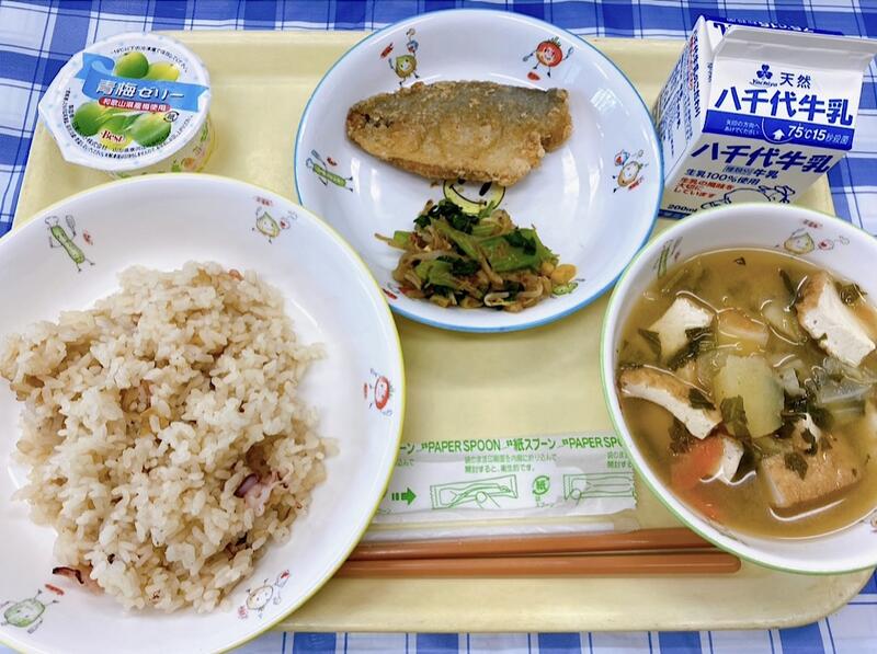 たこめし、あじのガーリックフライ、もやしとコーンの和え物、生揚げとキャベツの味噌汁、青梅ゼリー、牛乳