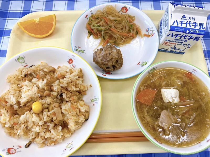中華おこわ、ごま肉団子、バンサンスー、白菜スープ、牛乳