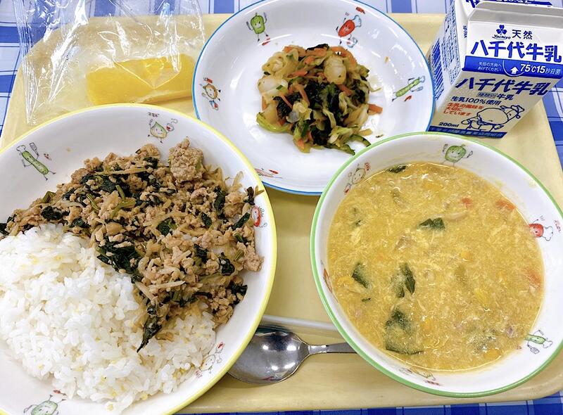 ごはん、ビビンバ(具)、チョレギサラダ、コーン卵スープ、冷凍パイン、牛乳