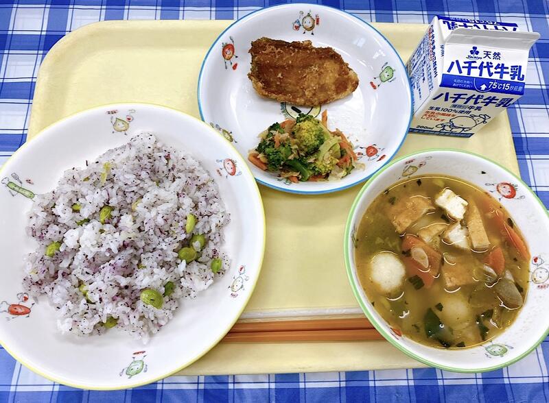ゆかり枝豆ごはん、ほっけのから揚げ、ブロッコリーのおかかツナマヨ、だまこ汁、牛乳