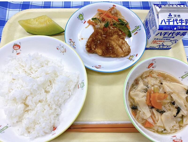 ごはん、ユーリンチー、春雨サラダ、ワンタンスープ、メロン、牛乳